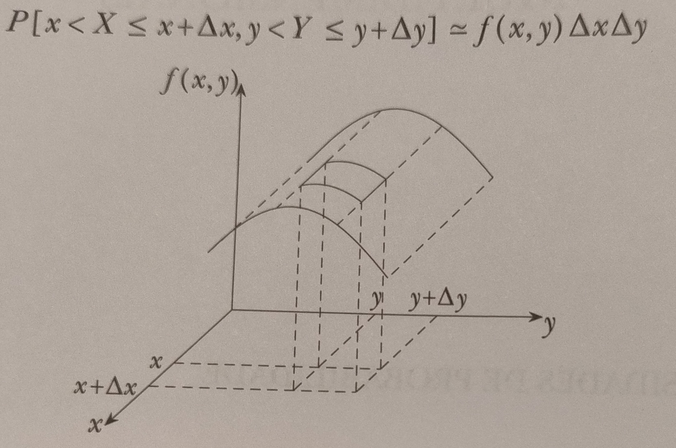 Segundo Dantas (2013), a interpretação da função densidade de probabilidade no caso bidimensional é a seguinte: seja \((x,y)\) um ponto do plano e consideremos um retângulo de lados \(\Delta x\) e \(\Delta y\) construído a partir do ponto \((x,y)\). A probabilidade de que \((X,Y)\) pertença a esse retângulo é aproximadamente igual ao volume do paralelepípedo de lados \(\Delta x\) e \(\Delta y\) e cuja altura é \(f(x,y)\), ou seja,