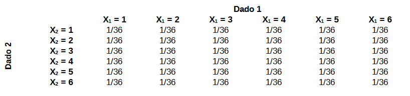 Exemplo Lançamento de dois dados honestos. Seja \(X_1\) o valor da face do primeiro dado e \(X_2\) o valor da face do segundo dado a distribuição conjunta do vetor aleatório \((X_1, X_2)\) é dada por