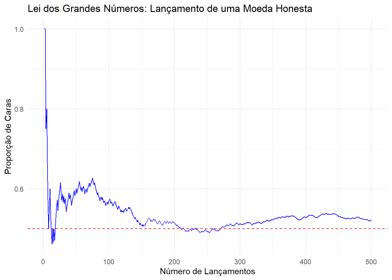 # Carregar as bibliotecas necessáriaslibrary(ggplot2)library(dplyr)# Definir o número de lançamentosn <-500# Simular lançamentos de uma moeda honestaset.seed(123) # Para reprodutibilidadelancamentos <-sample(c("Cara", "Coroa"), n, replace =TRUE)# Calcular a proporção acumulada de carasdados <-data.frame(lancamentos) %>%mutate(n =row_number(),proporcao_cara =cumsum(lancamentos =="Cara") / n )# Criar o gráficoggplot(dados, aes(x = n, y = proporcao_cara)) +geom_line(color ="blue") +labs(title ="Lei dos Grandes Números: Lançamento de uma Moeda Honesta",x ="Número de Lançamentos",y ="Proporção de Caras") +geom_hline(yintercept =0.5, linetype ="dashed", color ="red") +theme_minimal()
