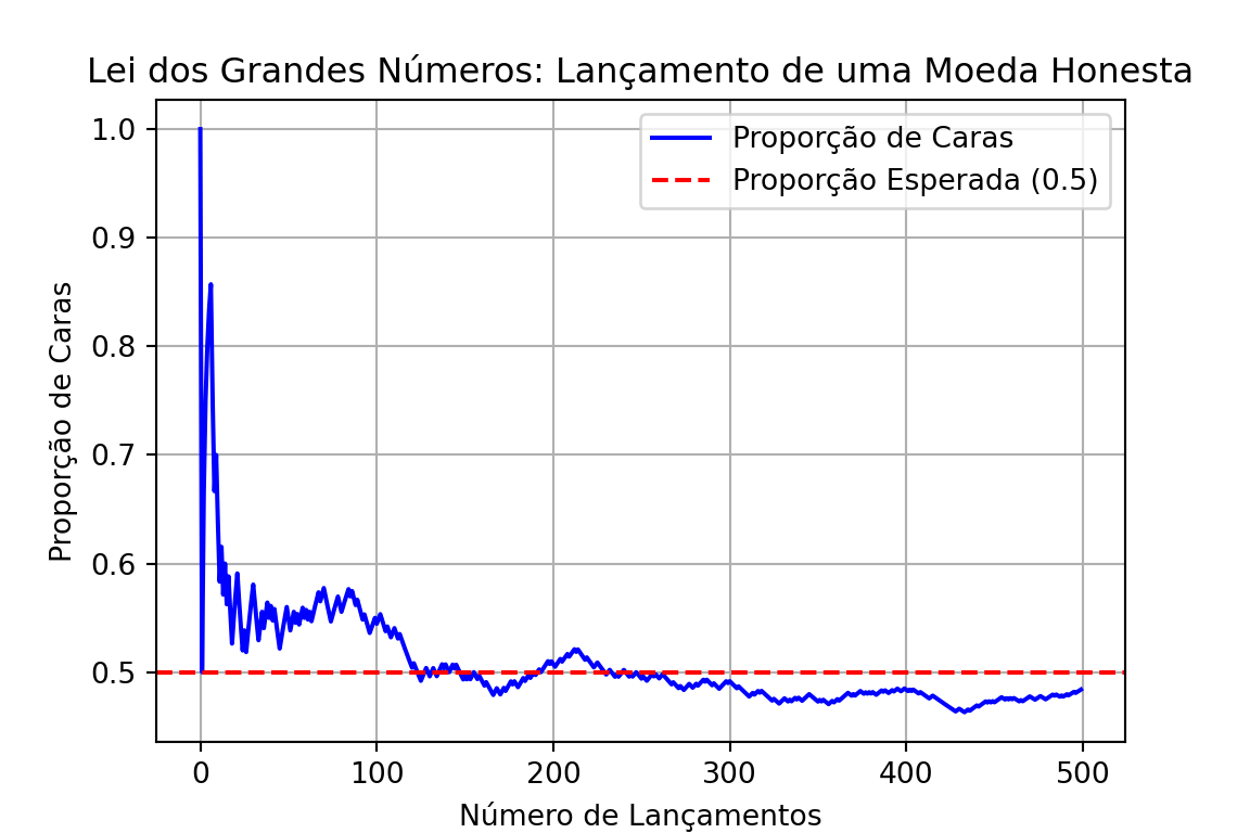 import numpy as npimport matplotlib.pyplot as plt# Definindo o número de lançamentosn =500# Simulando lançamentos de uma moeda honestanp.random.seed(123) # Para reprodutibilidadelancamentos = np.random.choice(['Cara', 'Coroa'], size=n)# Calculando a proporção acumulada de carasproporcao_cara = np.cumsum(lancamentos =='Cara') / np.arange(1, n +1)# Criando o gráficoplt.figure(figsize=(6, 4))plt.plot(proporcao_cara, color='blue', label='Proporção de Caras')plt.axhline(y=0.5, color='red', linestyle='--', label='Proporção Esperada (0.5)')plt.title('Lei dos Grandes Números: Lançamento de uma Moeda Honesta')plt.xlabel('Número de Lançamentos')plt.ylabel('Proporção de Caras')plt.legend()plt.grid()plt.show()